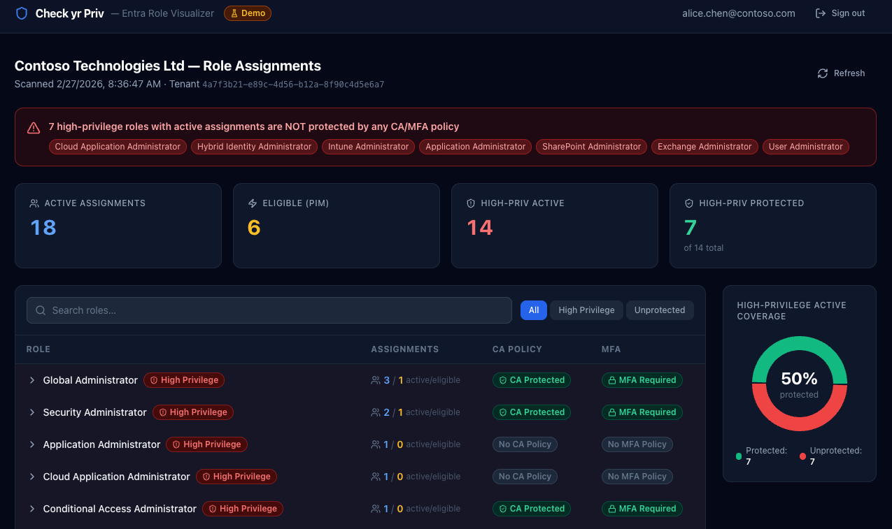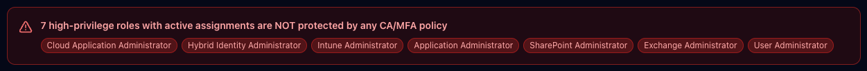 When you sign in, you see a summary of active assignments, PIM-eligible roles, and how many high-privilege roles are covered by Conditional Access or MFA requirements. If there are permanently active high-privilege assignments without policy protection, they’re surfaced immediately with no hunting required.