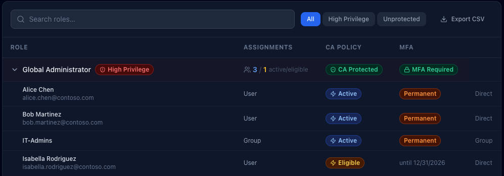 You can filter down to high-privilege roles only. Or to unprotected assignments only. Or export a CSV of the data. The goal isn’t exhaustiveness for its own sake. It’s focus.