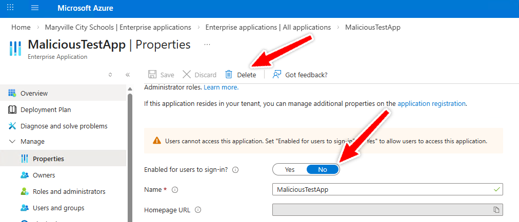 In Entra ID → Enterprise Applications, locate the suspicious app and take action: