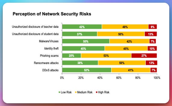 This suggests a perception gap, not ignorance. Tools are being purchased, controls are being implemented, but threat modeling may still be abstract. Student data, staff identities, and operational continuity are treated as protected because controls exist, not because adversaries have been realistically considered.